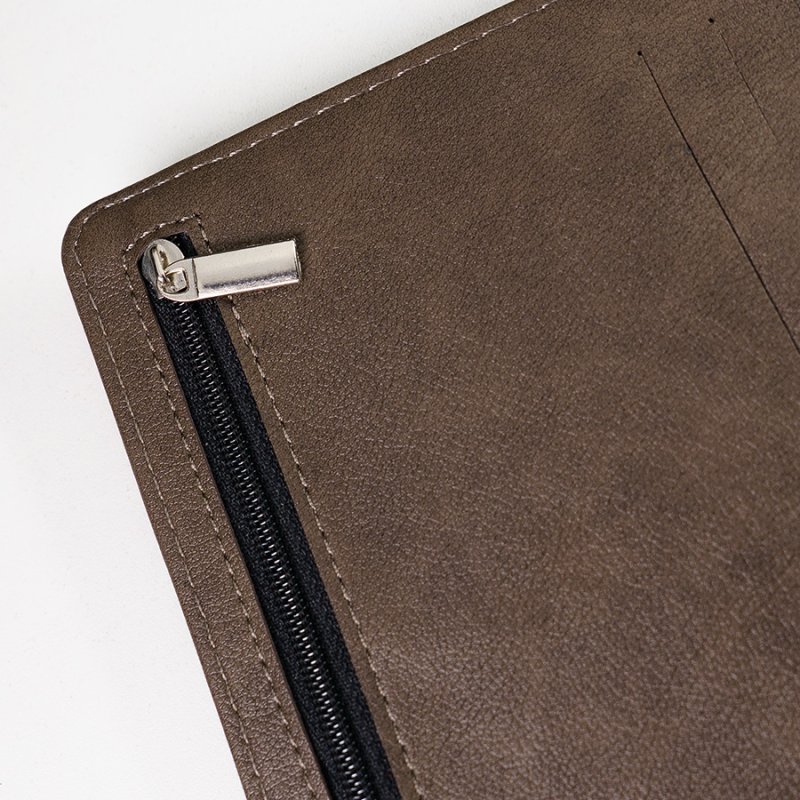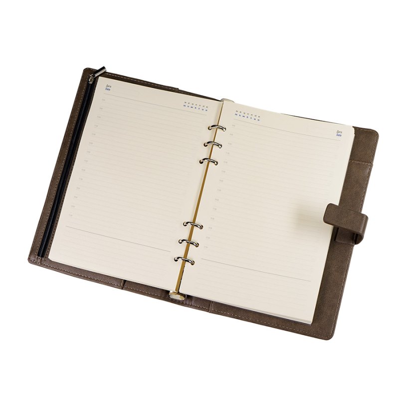 Цвет обложки, близкий к пантону 411СРазмер обложки 165*225 мм Размер блока 155*215 мм Переплет твердый, крепление на кольцах Обложка PU Pinto с магнитным клапаном Блок недатированный, в линейку Прямые углы, двухкрасочная печать Бумага кремовая, плотность 70г м2 320 страниц, пенхолдер Карманы для карт, отделение на молнии