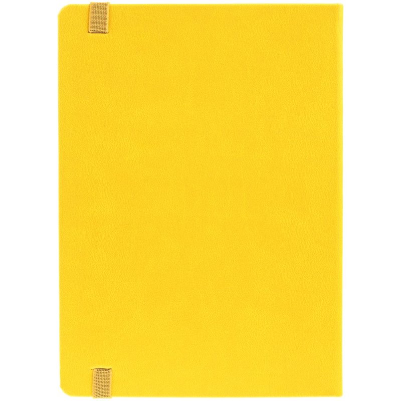 Ежедневник с твердой обложкой, выполнен из материала Latte, желтый КК, обрез зеленого цвета, дополнен ляссе желтого цвета и резинкой с металлическим шильдом.