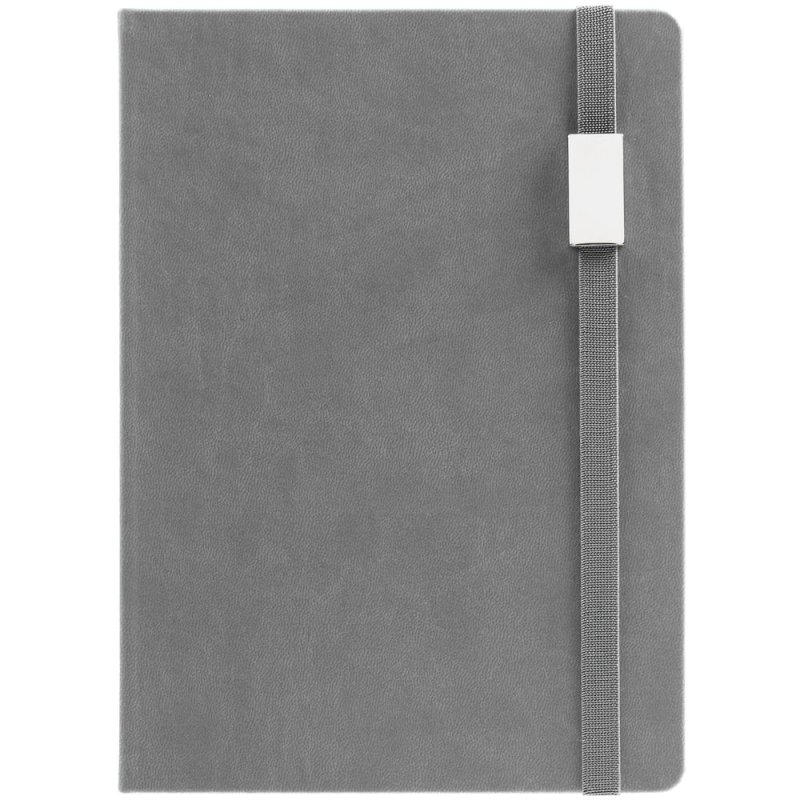Ежедневник с твердой обложкой, выполнен из материала Latte, серый СС, обрез серого цвета, дополнен ляссе серого цвета и резинкой с металлическим шильдом.