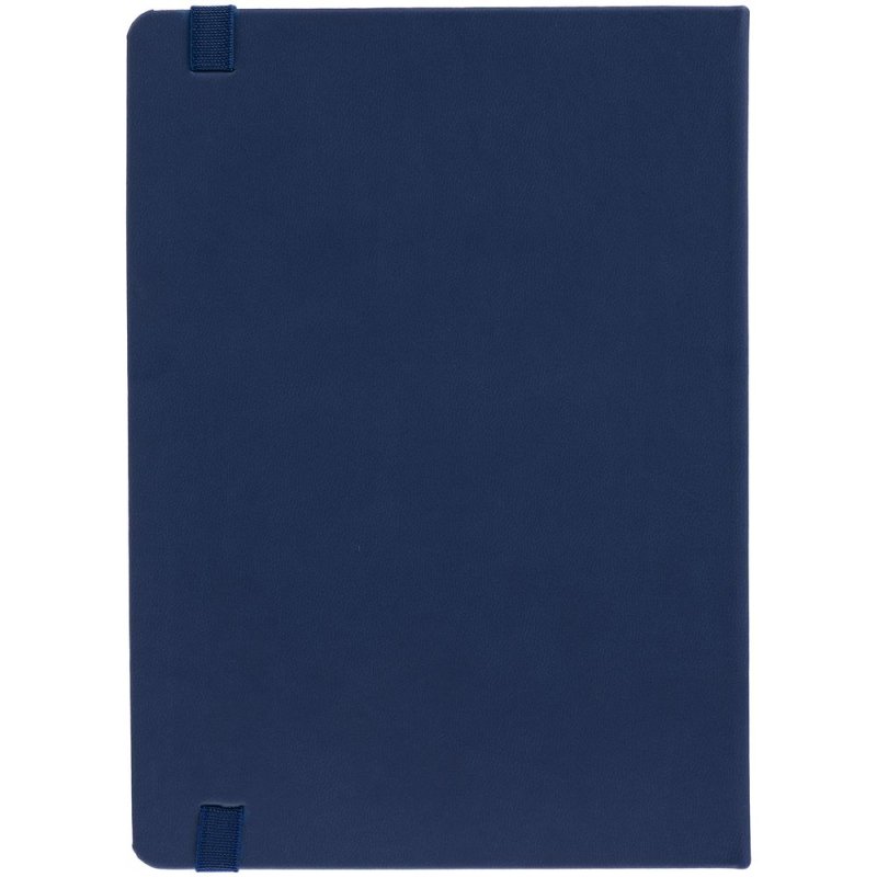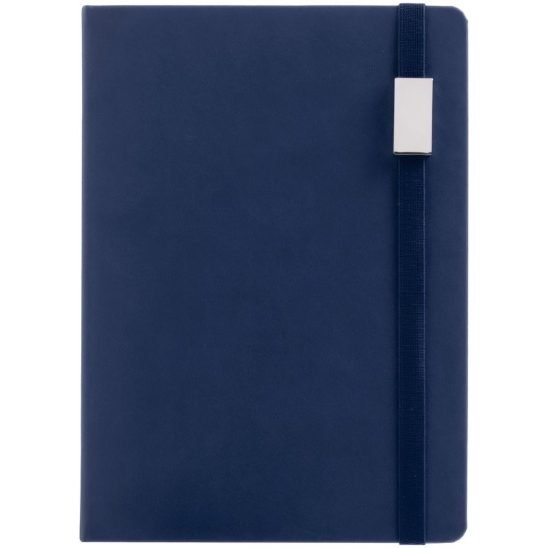 Ежедневник с твердой обложкой, выполнен из материала Latte, темно-синий ХХ, обрез темно-синего цвета, дополнен ляссе темно-синего цвета и резинкой с металлическим шильдом.