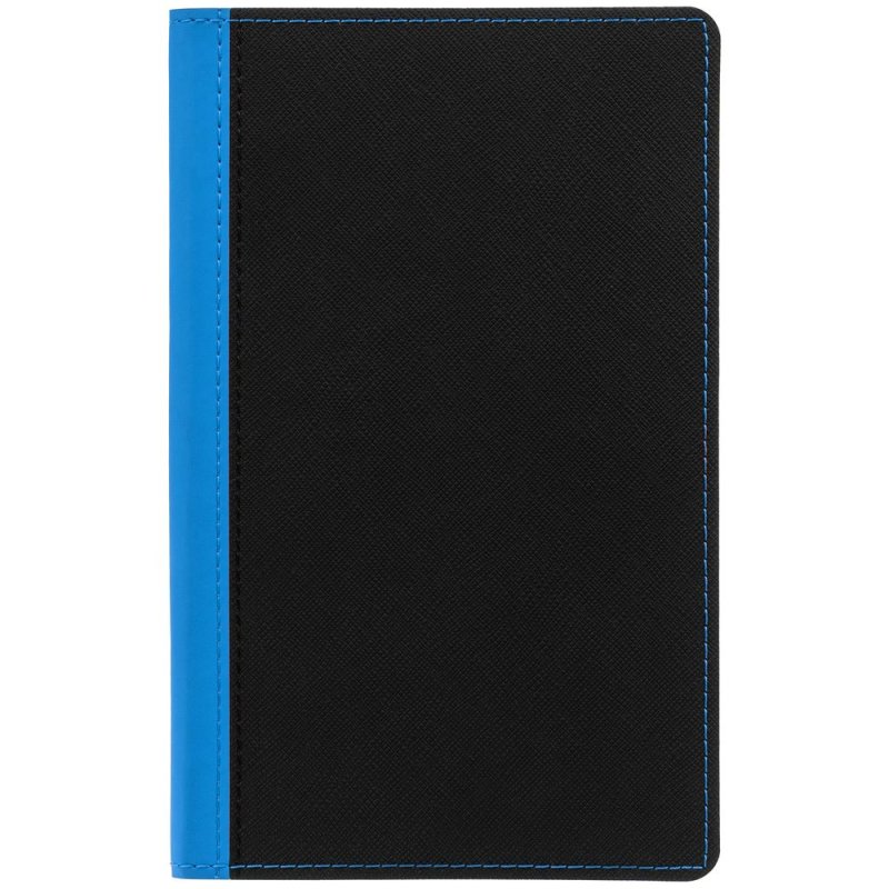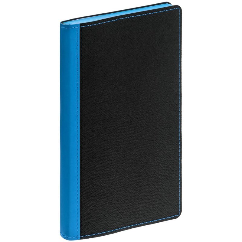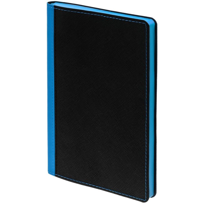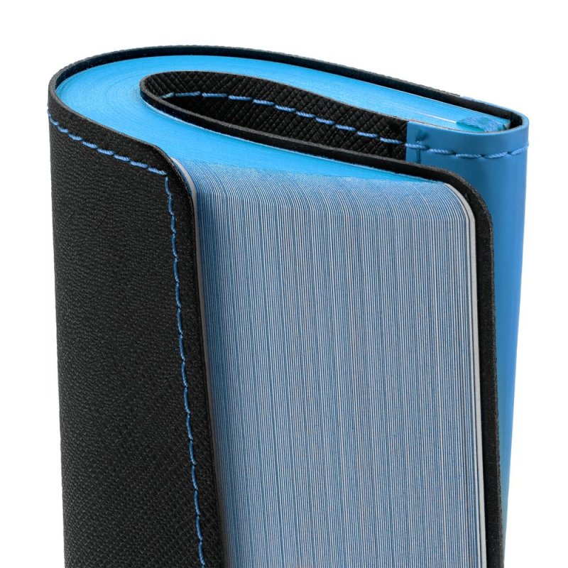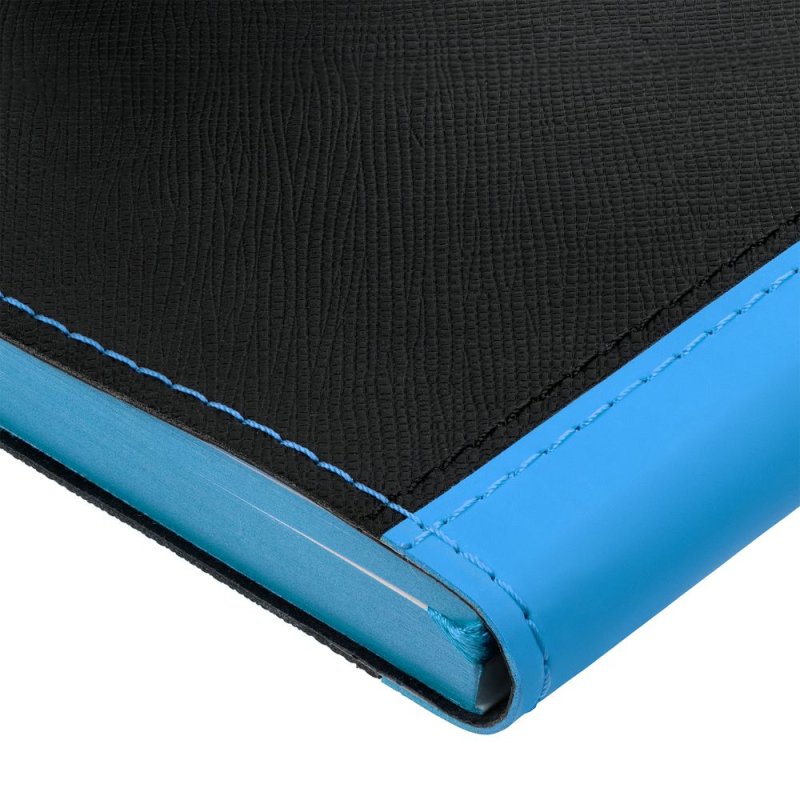 Ежедневник с гибкой обложкой выполнен из материала Nice Touch, черный АА и Soft Touch Ultra, голубой JJ, дополнен ляссе голубого цвета.