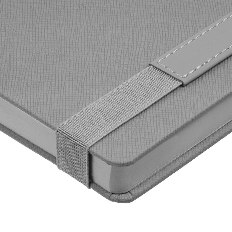 Ежедневник с твердой обложкой, выполнен из материала Nice Touch, серый СС, дополнен резинкой с шильдой из материала Soft Touch и ляссе в цвет обложки.