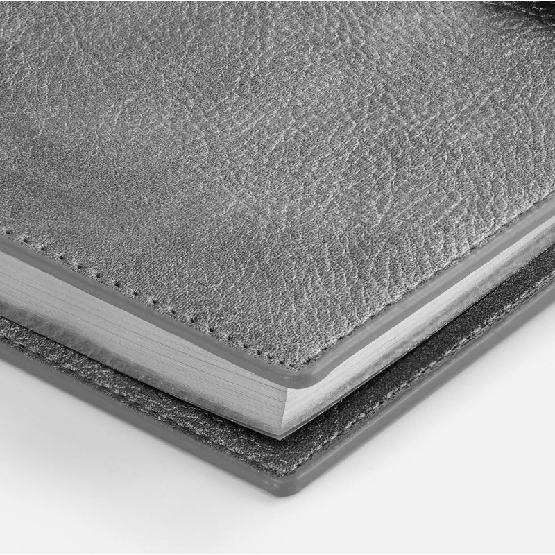 Ежедневник в мягком переплете со съемной обложкой, дополнен застежкой-хлястиком с металлическим шильдом на кнопке, двойным ляссе и капталом.