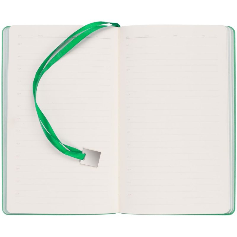 Ежедневник с гибкой обложкой, выполнен из материалов Soft Touch Ultra, зеленый FF, и Latte, зеленй (внутренняя часть обложки), дополнен ляссе в цвет обложки с металлическим шильдиком.