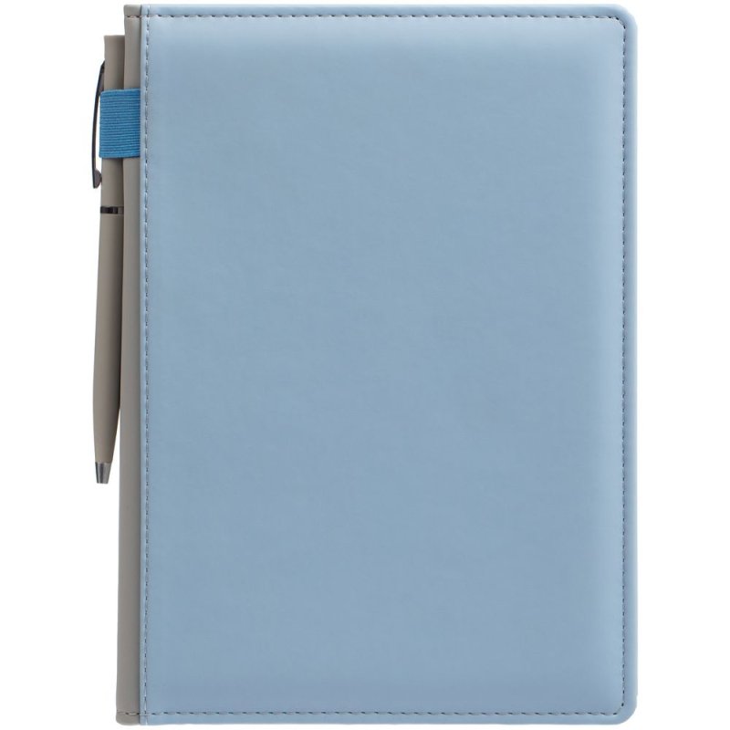 Твердая обложка с поролоном, материал обложки — Soft Touch, голубой JJ и Soft Touch, серый СС. На корешке ежедневника находится петля из резинки.