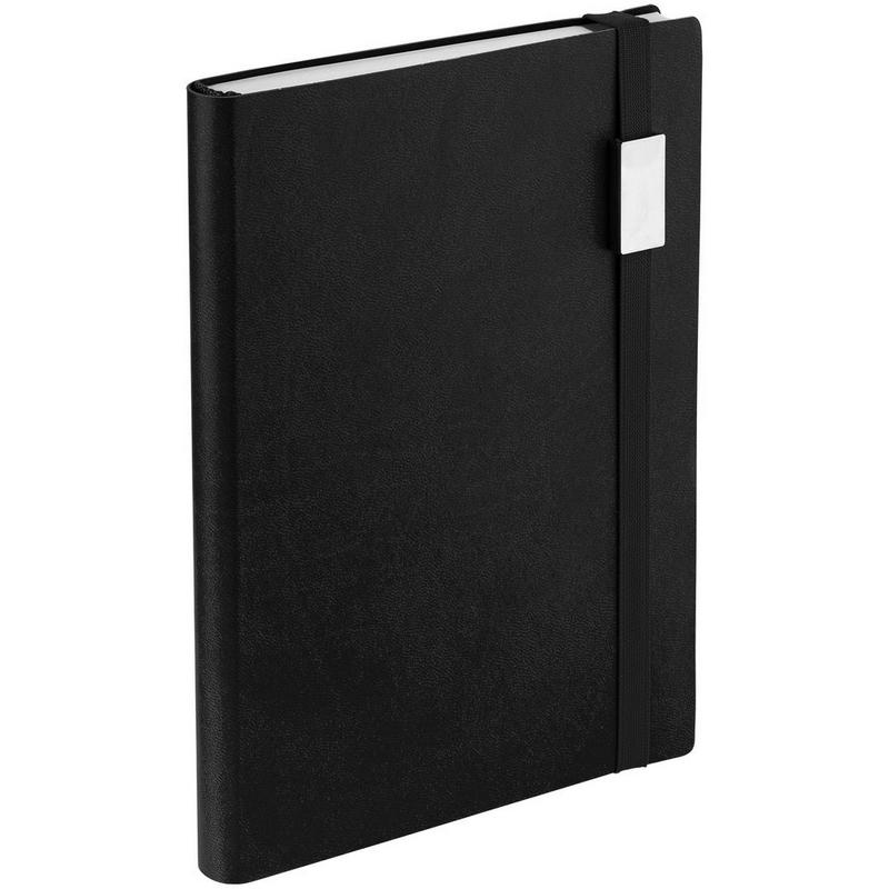 Ежедневник с гибкой обложкой выполнен из материала Brand, черный АА, и дополнен резинкой шириной 1 см с металлическим шильдом, капталом, ляссе черного цвета.