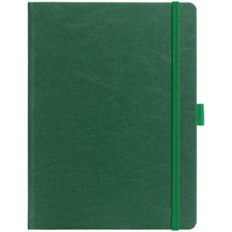 Еженедельник в твердой обложке выполнен из материала Nebraska, зеленый FF, дополнен резинкой, петлей для ручки и ляссе зеленого цвета.