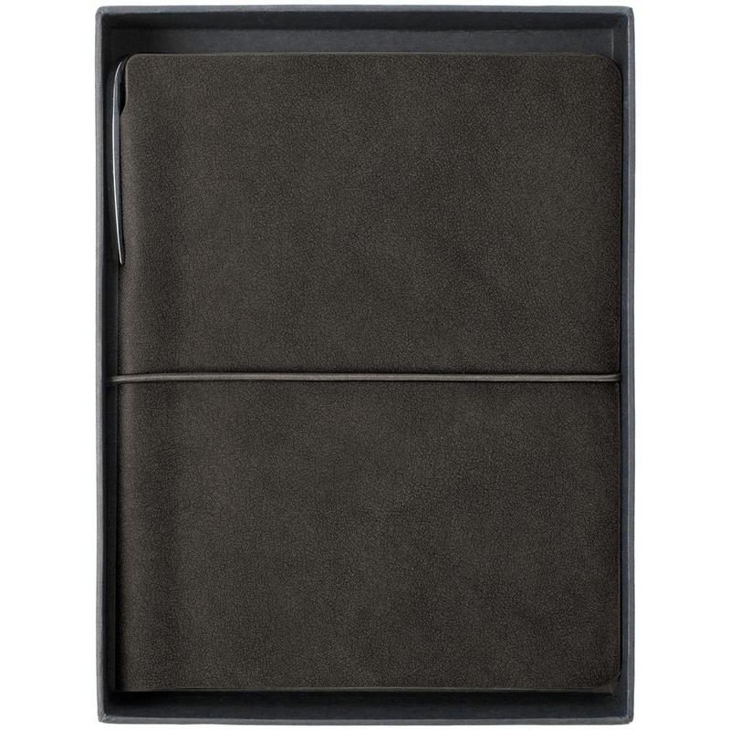 Ежедневник из искусственного материала, напоминающего замшу, и ручка с покрытием софт-тач, которая удобно прячется за обложку ежедневника.