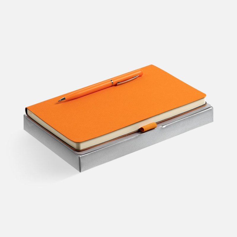 Зауженный ежедневник и ручка комплементарного оттенка в простой лаконичной коробке — готовое предложение делового подарка для сотрудников и партнеров.