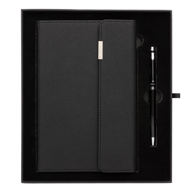 Этот набор идеально подойдет тем, кто хочет выглядеть в офисе утонченно. Обложка блокнота выполнена из текстурированного PU с металлическим лого, внутри 80 листов (160 страниц) линованной кремовой бумаги плотностью 80 г/м². Ручка заправлена немецкими чернилами, способна прочертить линию длиной до 1200 метров. Набор упакован в роскошную подарочную коробку.
