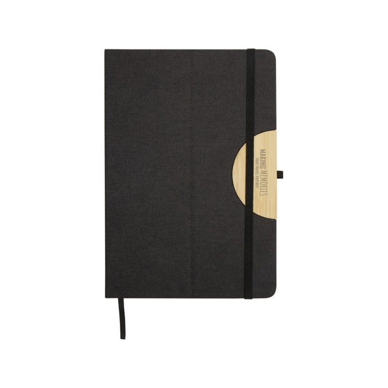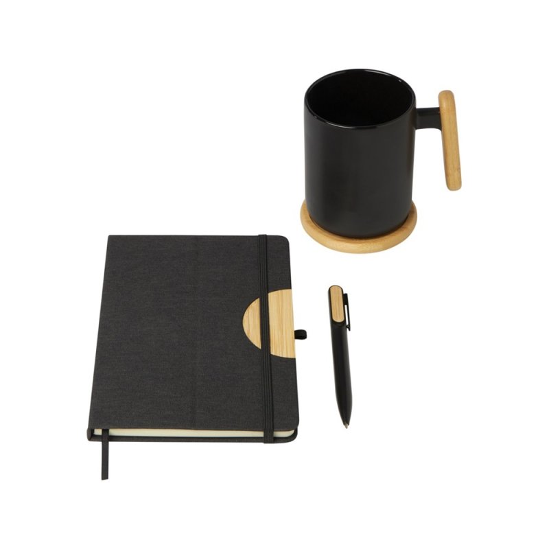 В подарочный набор Laura входит блокнот в твердой обложке RPET формата A5, шариковая ручка, керамическая кружка и подставка. Блокнот имеет черную эластичную застежку и ленточную закладку, а также 80 разлинованных листов бумаги плотностью 80 г/м² кремового цвета. Чехол для ноутбука вместе с бамбуковым полукругом выполняет функцию подставки для телефона. Шариковая ручка изготовлена из переработанного алюминия, сертифицированного RCS, с черным напылением и имеет бамбуковые аксессуары с обеих сторон верхнего корпуса. Чернила для ручки: черный. Длина непрерывной линии: 400 метров. Керамическая кружка объемом 480 мл поставляется с бамбуковой подставкой. Мыть только вручную. Размер кружки: 11 х 12,7 см. Диаметр подставки: 9,5 см. Размер подарочной коробки: 32 x 27 x 10,3 см. FSC certified paper, FSC certified cardboard, Recycled Aluminium. #?0:>2:0: FSC Mix Credit P5.1 CU-COC-877277. FSC Mix Credit P7.1 CU-COC-877277.