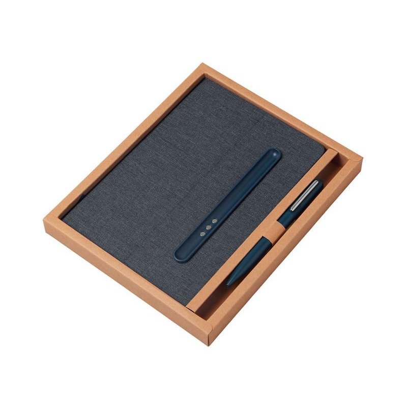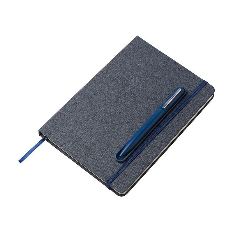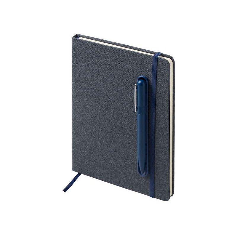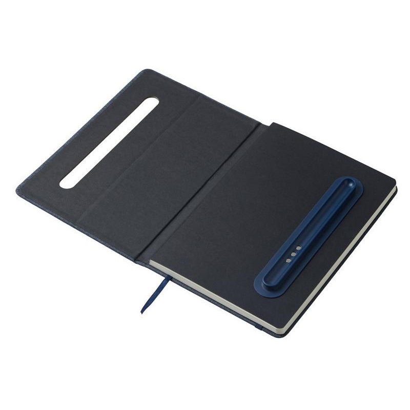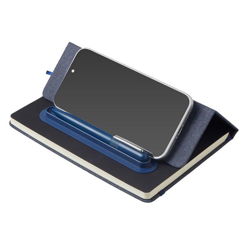 Блокнот в твердой обложке из rpet-пластика с металлической шариковой ручкой. В обложке магнитный держатель для ручки. Также верхняя часть обложки трансформируется в подставку для телефона.