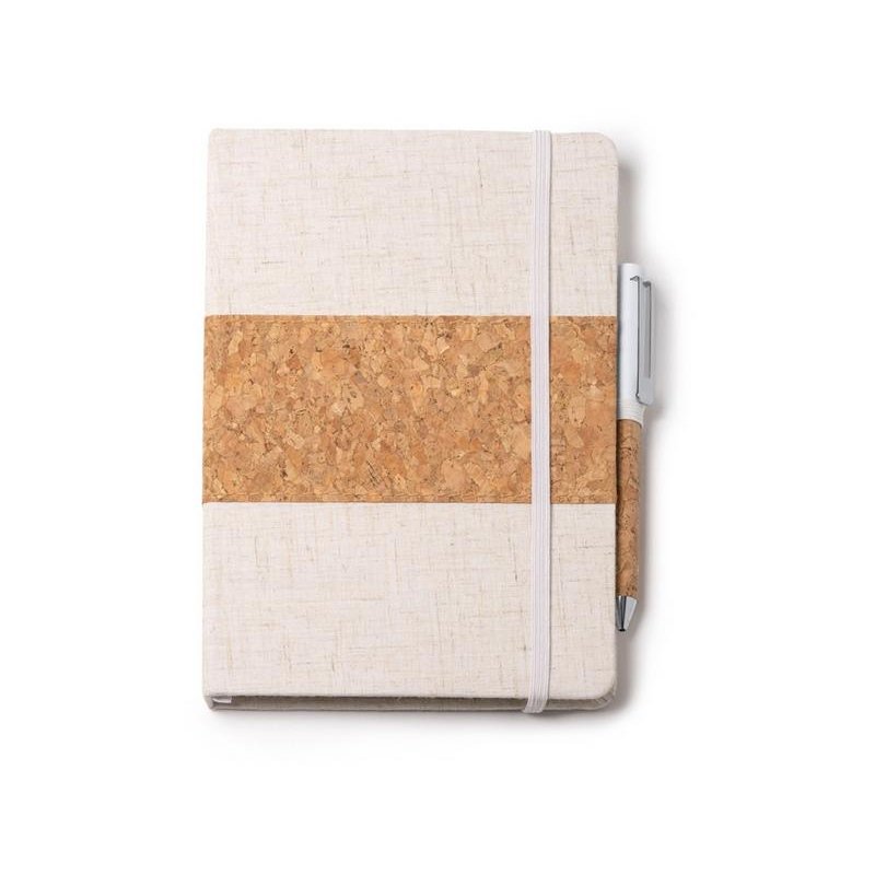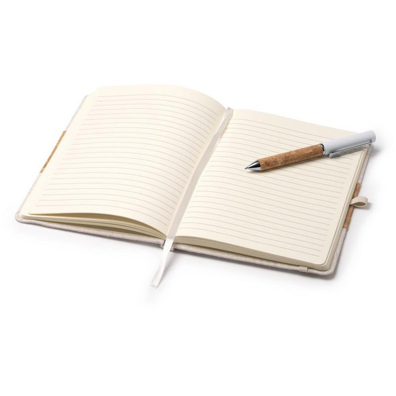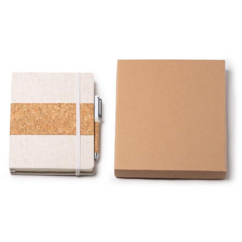 Набор состоит из блокнота A5 и ручки в коробке из крафта. Блокнот в твердой обложке из хлопка и пробки с 80 линованными листами. Металлическая шариковая ручка в корпусе из пробки и с синими чернилами.
