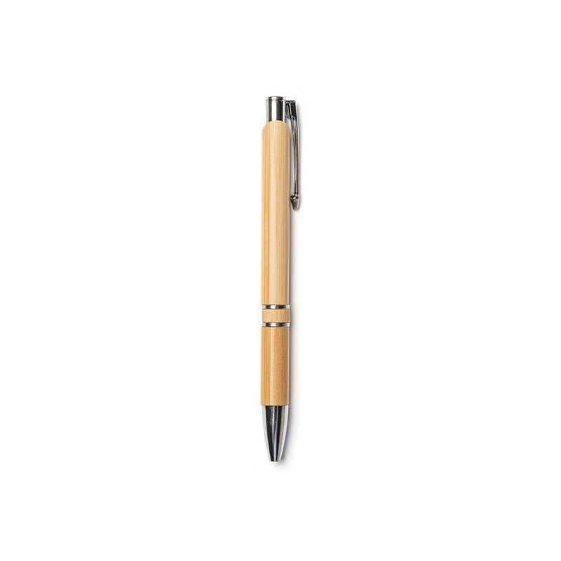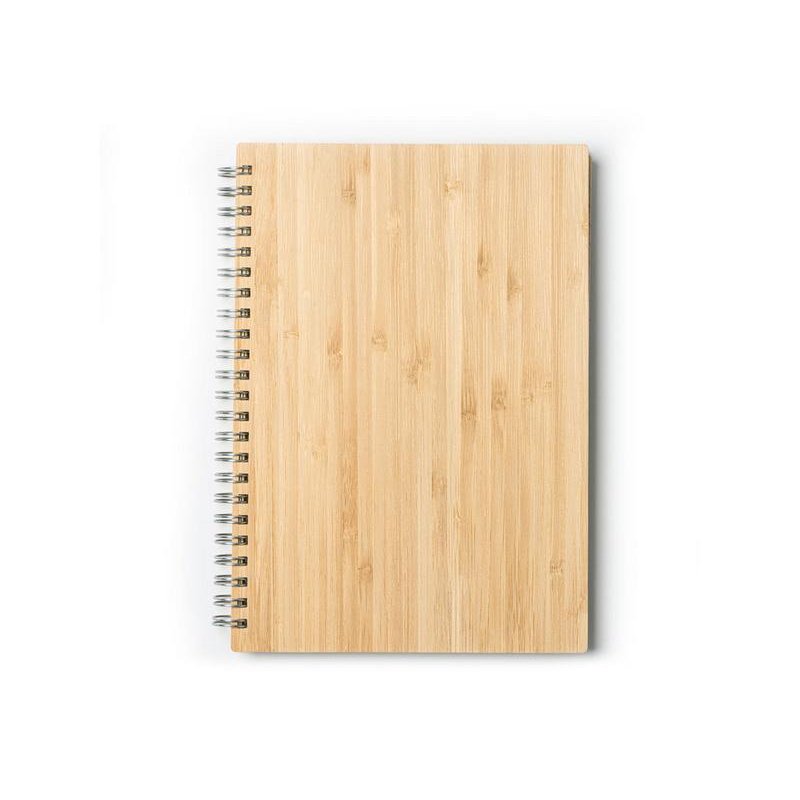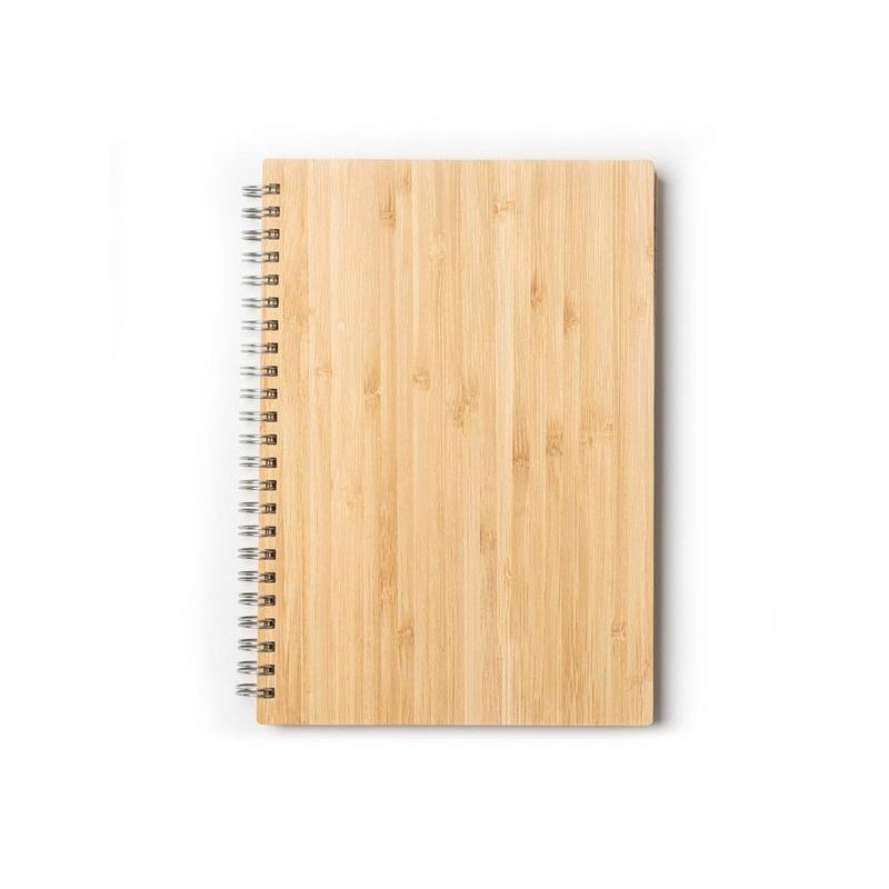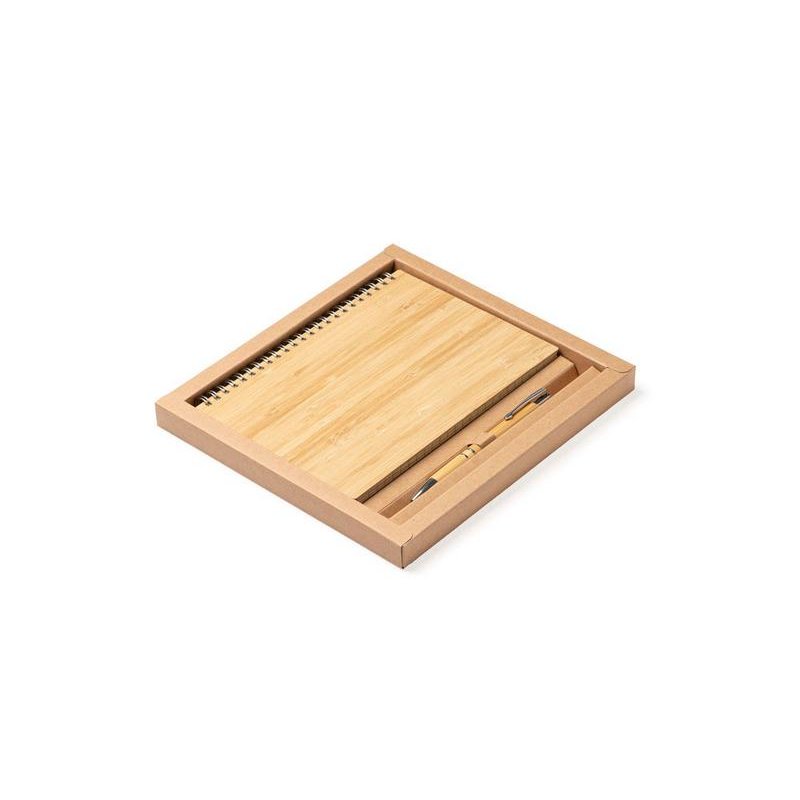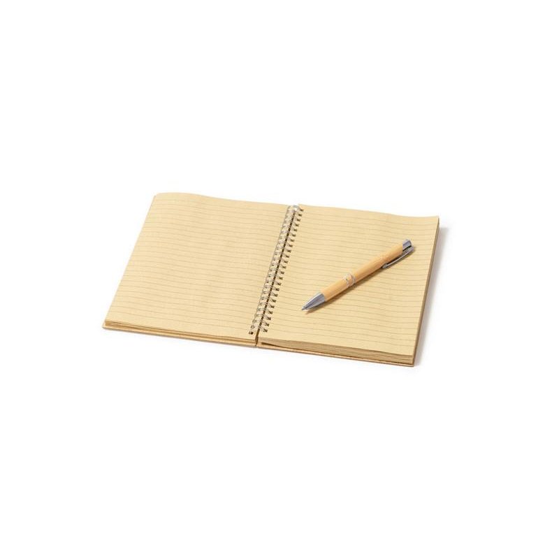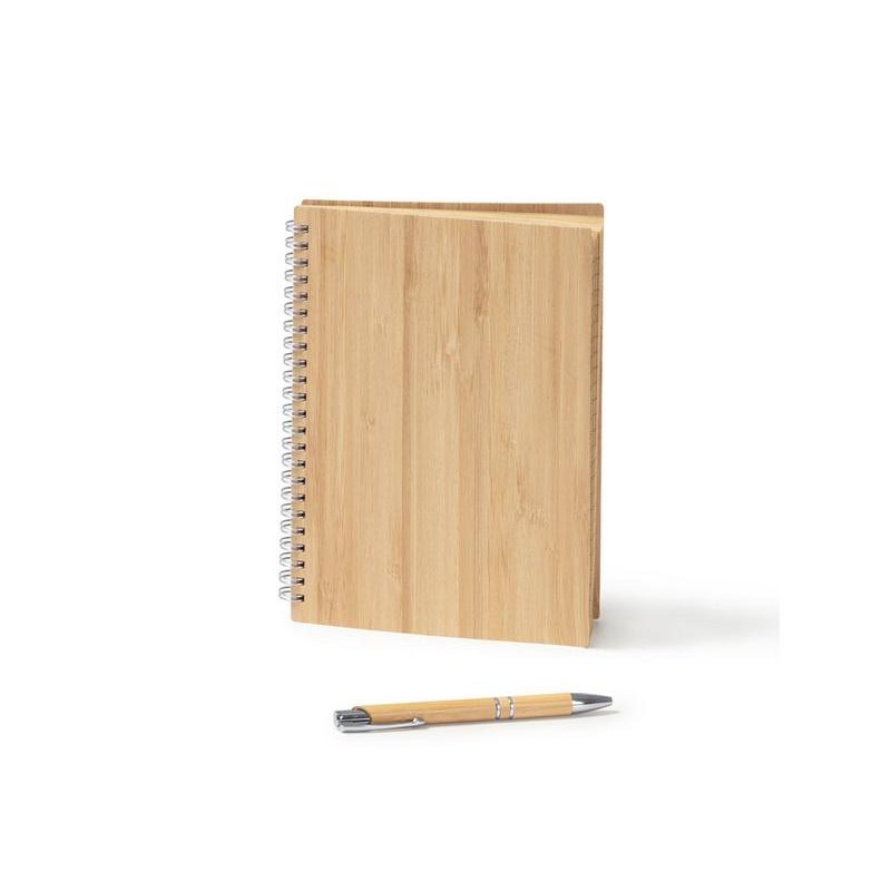 Блокнот и ручка из бамбука формата А5. Блокнот с твердой обложкой и 80 разлинованными листами из переработанной бумаги. Шариковая ручка с хромированными деталями и синими чернилами.
