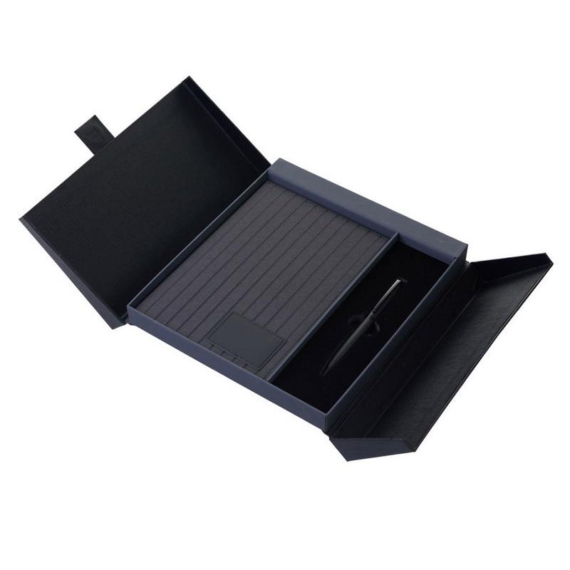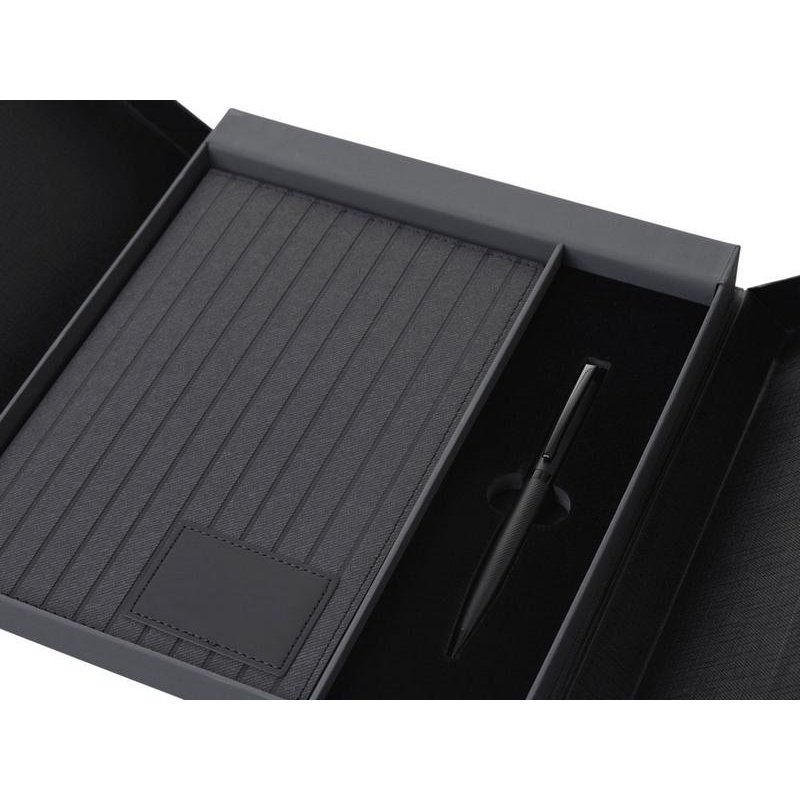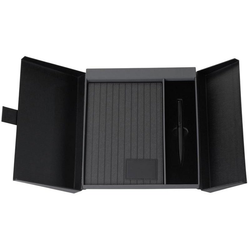 Bradbury & Co - это элегантный подарочный набор, упакованный в красивую коробку на магните. Внутри — блокнот в обложке из рифленой экокожи и металлическая шариковая ручка. Ручка гармонирует с блокнотом за счет рифленой нижней части, а блокнот имеет специальный патч для нанесения логотипа (который можно также нанести на более ровную поверхность на обороте блокнота) и ляссе-закладку для удобства.При гравировке на ручке вскрывается эффектный серебристый цвет.