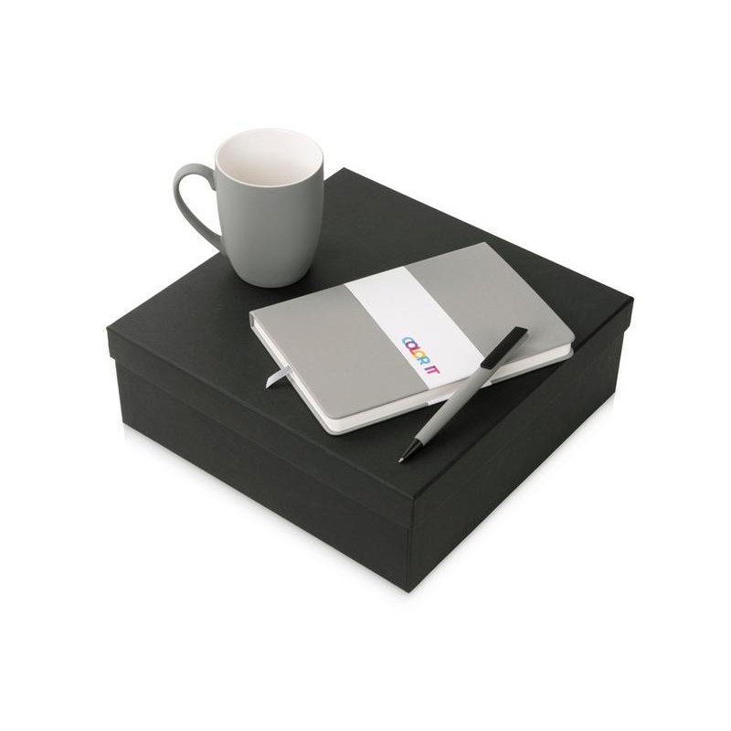 - Материал товара:блокнот - искусственная кожа с покрытием soft-touch, ручка - пластик с покрытием soft-touch, кружка - фарфор с покрытием soft-touch.