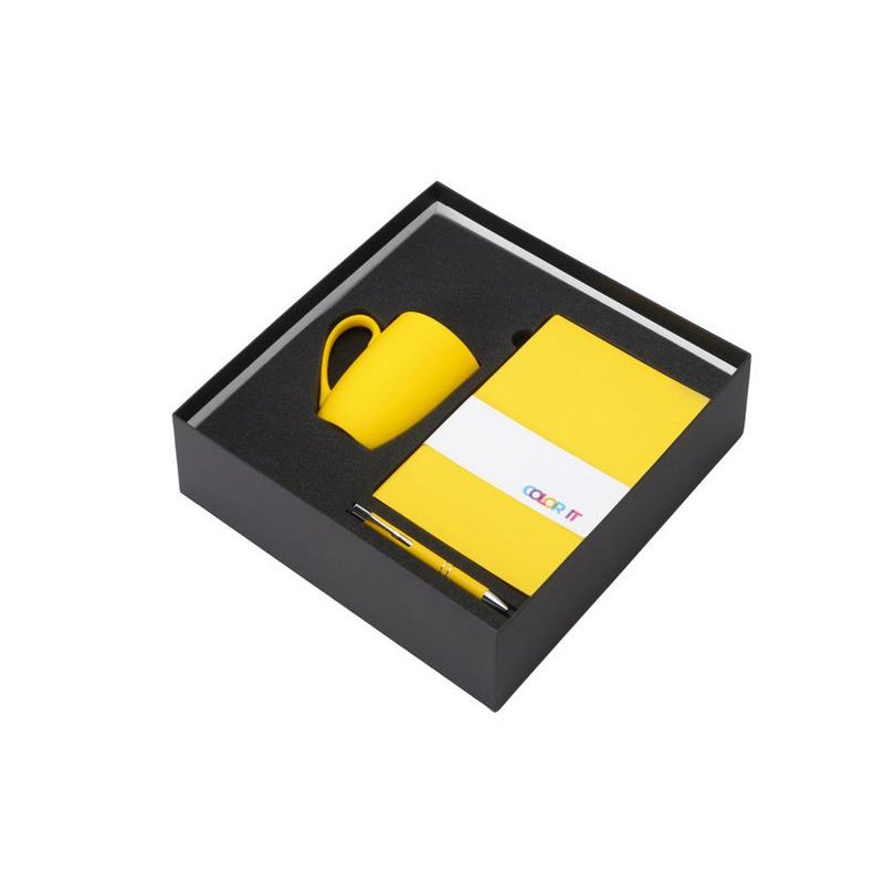 - Материал товара:блокнот - искусственная кожа с покрытием soft-touch, ручка - алюминий с покрытием soft-touch, кружка - фарфор с покрытием soft-touch, коробка - картон