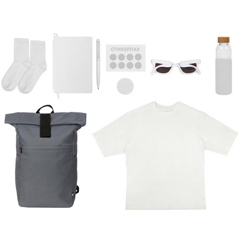 - Материал товара:рюкзак- 300D RPET полиэстер, футболка- 100% хлопок, джерси, носки- 80% хлопок, 15% полиамид, 5% эластан, бутылка- стекло, очки и держатель- пластик, ланъярд- полиэстер, ручка- металл, блокнот- термо PU