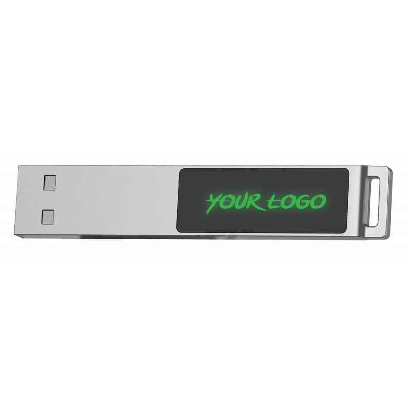Флешка в тонком металлическом корпусе с пластиковой самоклеящейся шильдой в комплекте. Благодаря встроенной в корпус светодиодной матрице, логотип, выполненный на шильде методом лазерной гравировки, подсвечивается белым, красным, зеленым или синим в зависимости от выбранной модели.