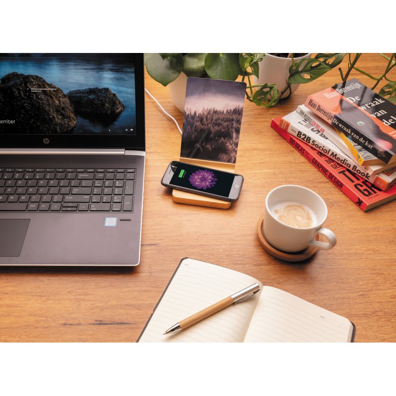 Док-станция 5 Вт из натурального бамбука с функцией беспроводной зарядки и акриловая рамка для фотографий (15х10 см). Поставляется со 150-сантиметровым кабелем из материала TPE (без ПВХ). Не скользит даже на гладких поверхностях благодаря резиновым ножкам. Подходит для зарядки всех устройств, поддерживающих стандарт QI (смартфоны Android последнего поколения, iPhone 8 и выше). Вход: 5 В / 2 А; Беспроводной выход: 5 В / 1 А - 5 Вт.
