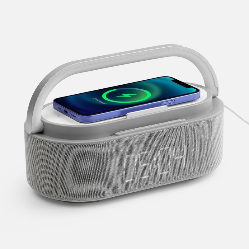 Veske — это Bluetooth-колонка с электронными часами, площадкой для беспроводной зарядки смартфона и подсветкой.