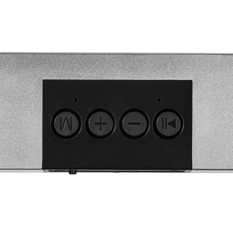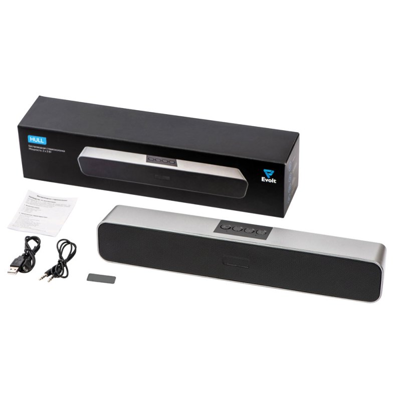 Портативная стереоколонка имеет два динамика по 3 Вт каждый, которые стереофонически распределяют звук. Саундбар воспроизводит музыку с USB-флешки и с SD-карты, а также по Bluetooth.