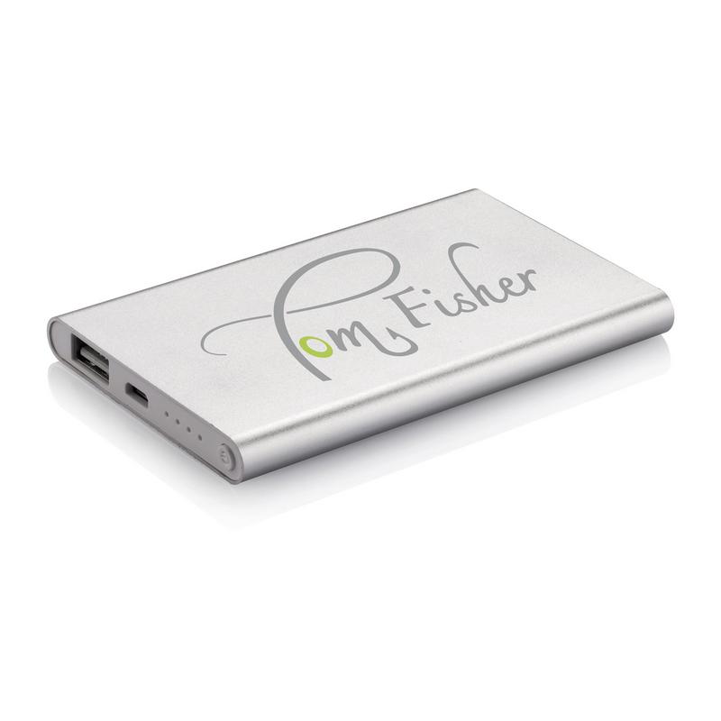 Тонкое зарядное устройство в прочном алюминиевом корпусе со встроенным литий полимерным аккумулятором емкостью 4000 mAh. На корпусе расположена кнопка вкл/выкл и индикаторы уровня заряда. Поставляется в подарочной коробке. Максимальная мощность на выходе 5V/1А, на входе: 5V/800 mAh. В комплекте кабель micro-USB.