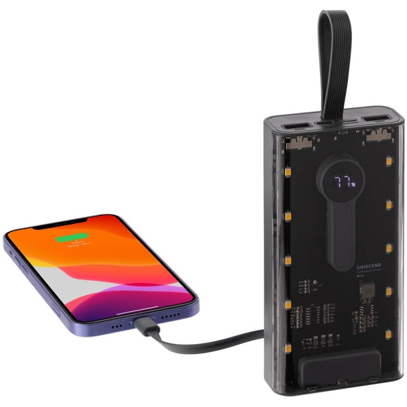 Необычный дизайн коллекции Uniscend Trellis выгодно выделяет новую серию устройств из прозаичного ряда внешних аккумуляторов. Они не поддерживают беспроводную зарядку, зато точно привлекают внимание: под прозрачной панелью хорошо видны электронная начинка и цифровой индикатор оставшегося в аккумуляторе заряда, а мягкая подсветка светодиодами теплого оттенка логичным образом дополняет технологичный внешний вид.
