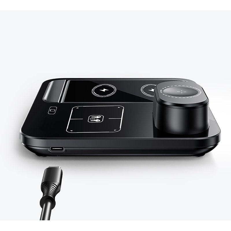 Автоматический подъёмный механизм панели для смартфона управляется сенсорной кнопкой, расположенной под зарядным блоком для наушников. Дополнительный бонус - зарядка смартфона возможна как в вертикальном, так и в горизонтальном положении (обе встроенные зарядные катушки выдают быструю зарядку до 15W).