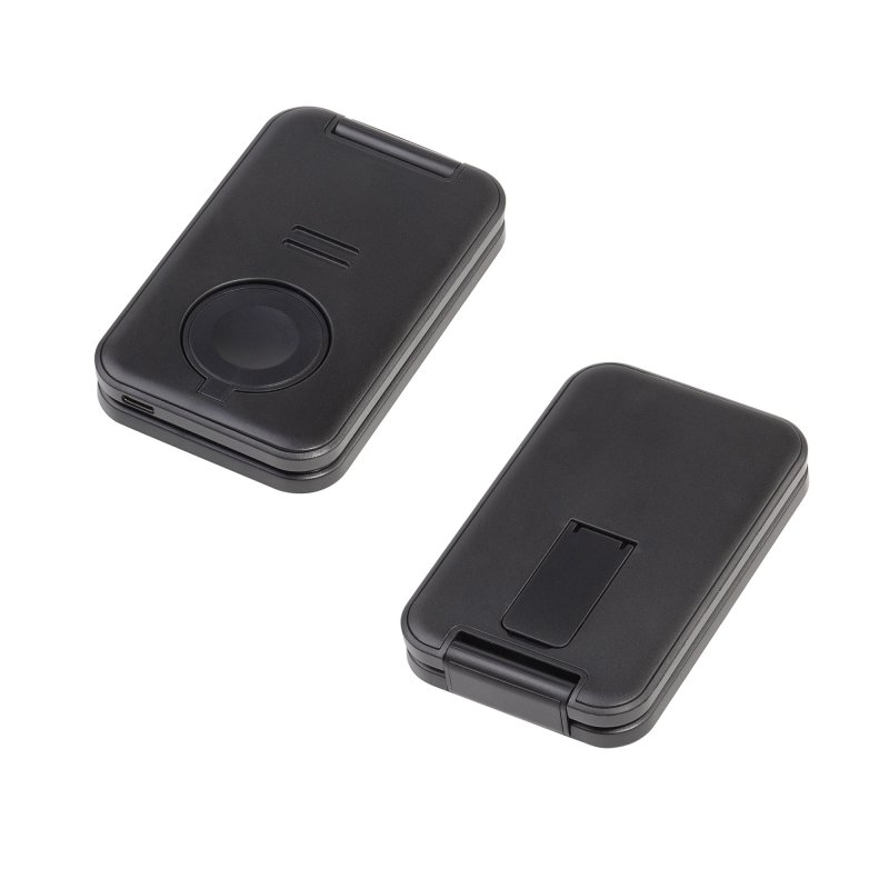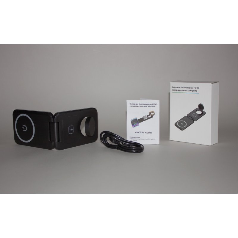 Компактный гаджет - складная беспроводная (15W) зарядная станция 3-в-1 с функцией MagSafe - магнитным держателем для iPhone двенадцатой серии и выше. Данный держатель позволяет закрепить (примагнитить) iPhone горизонтально на зарядном блоке для удобного просмотра фото/видео на его экране. Для большего удобства в конструкции подставки предусмотрены 2 угла обзора экрана.