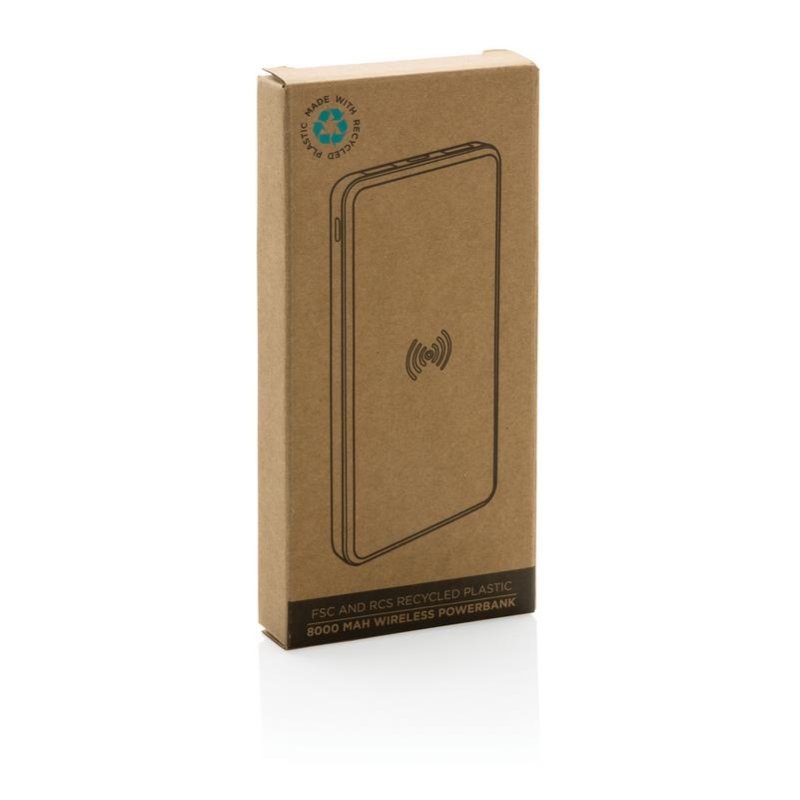 Внешний аккумулятор емкостью 8000 мАч изготовлен из сертифицированного RCS переработанного ABS-пластика и бамбука FSC®. Содержание вторсырья: 20% от общего веса изделия. Сертификация RCS обеспечивает полный контроль всей цепочки поставок переработанных материалов. Поддерживает беспроводную зарядку мощностью 5 Вт и зарядку через USB-порт с помощью кабеля. Есть порты micro USB и Type-C. Емкости аккумулятора хватит, чтобы полностью зарядить современный смартфон до 4-х раз. Вход micro USB: 5 В / 2 А; вход Type-C: 5 В / 2 А. Выход: 5 В / 2.4 А. Беспроводной выход: 5 В / 1 А (5 Вт). Поставляется в упаковке FSC® mix. В комплекте идет кабель из переработанного TPE, сертифицированного RCS.
