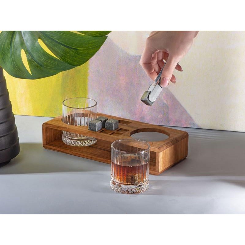 Для сервировки в набор входит дубовая подставка с отверстиями под бокалы и щипцы, а также выемки под кубики.