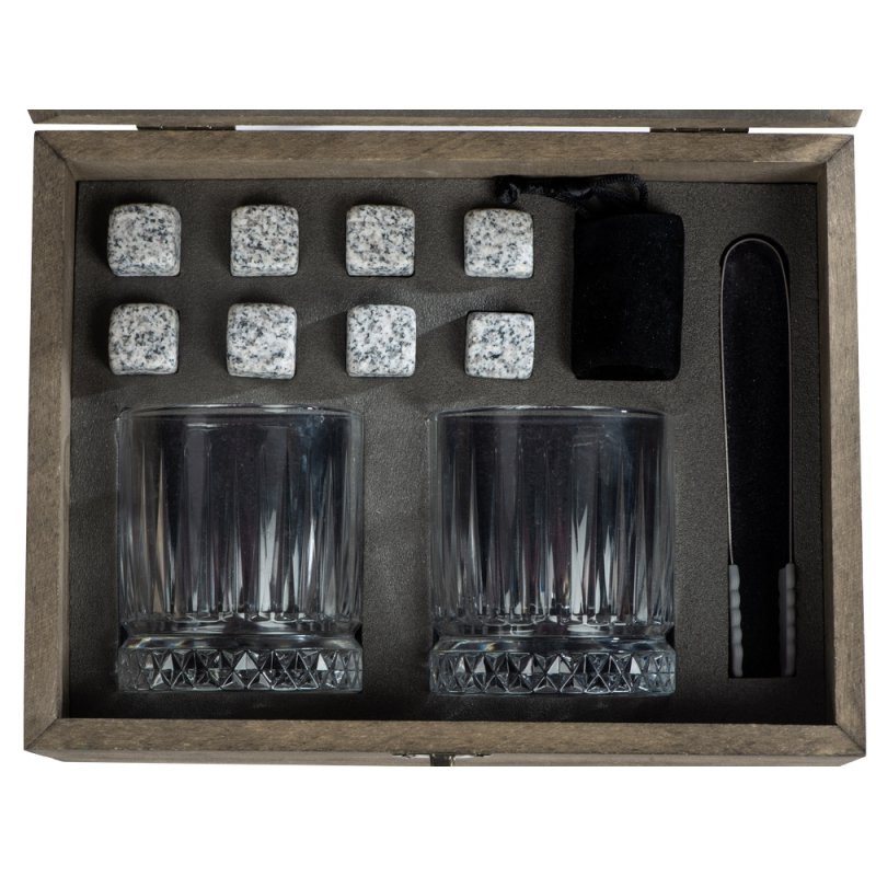 Набор для виски Jack состоит из двух стаканов с толстым дном, охлаждающих камней в мешочке, удобных щипцов и двух лаконичных костеров из сланцевого камня. Сет упакован в деревянную подарочную шкатулку, которая создает праздничное настроение еще до того, как вы откроете крышку. Более того, это уже готовый набор для подарка.