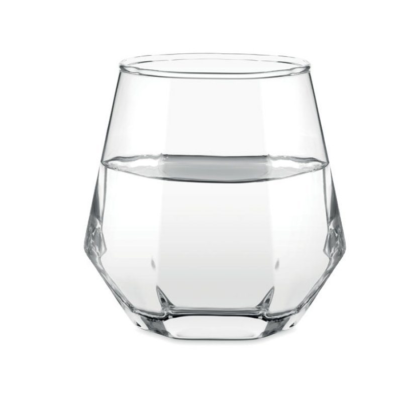Geometric diamond shaped tilted short drink glass. For whisky or other liquors. Capacity: 300ml.