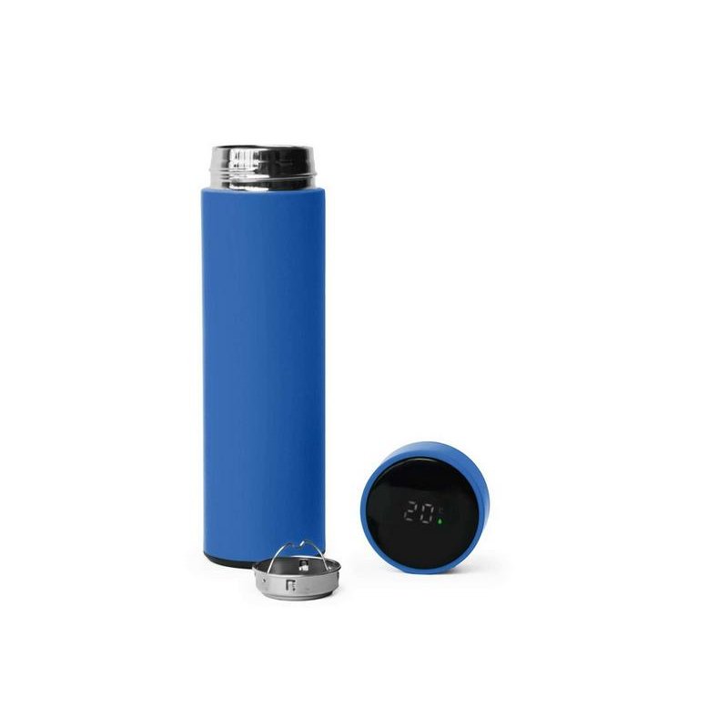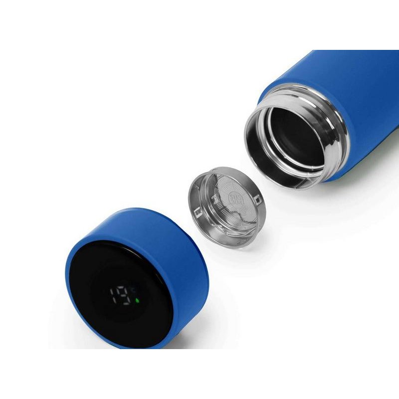 Термос из нержавеющей стали, покрытый цветным soft touch, с крышкой, в которой встроен термометр и LED дисплей, показывающий температуру внутри термоса. Объем: 500 мл. Упаковка: каждый термос в крафт коробке.