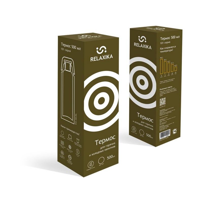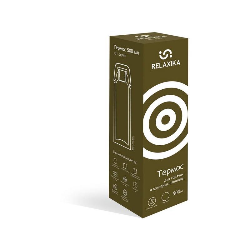 Классический термос Relaxika черного цвета с высокими показателями удержания температуры напитка для походов, путешествий, спорта и ежедневного использования. Прочные двойные стенки из высококачественной нержавеющей стали 18/8 с вакуумной изоляцией гарантируют, что ваш напиток останется холодным в течение 28 часов и горячим до 22 часов. Этот материал не только прочен, но и гигиеничен, не выделяет никаких вредных для здоровья веществ. Ваши напитки сохраняет естественный вкус и не приобретут посторонний запах.
