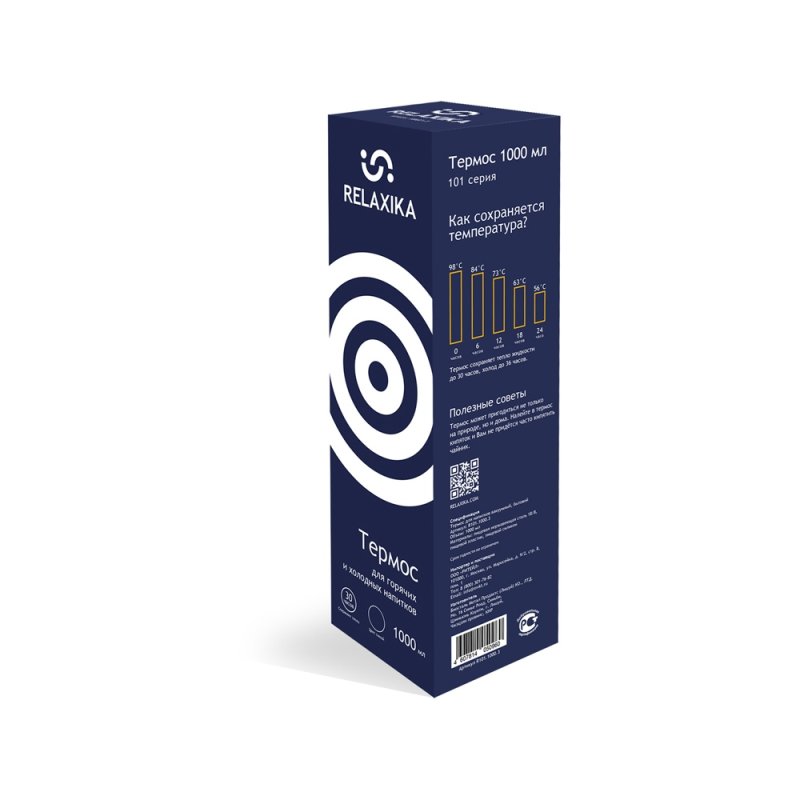 Классический термос Relaxika черного цвета с высокими показателями удержания температуры напитка для походов, путешествий, спорта и ежедневного использования. Прочные двойные стенки из высококачественной нержавеющей стали 18/8 с вакуумной изоляцией гарантируют, что ваш напиток останется холодным в течение 36 часов и горячим до 30 часов. Этот материал не только прочен, но и гигиеничен, не выделяет никаких вредных для здоровья веществ. Ваши напитки сохраняет естественный вкус и не приобретут посторонний запах.