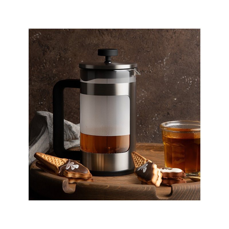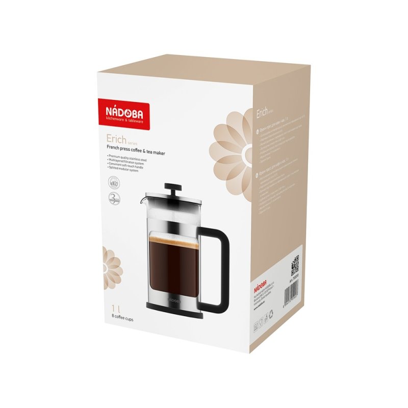 Френч-прессы серии Erich имеют колбу, выполненную из жаропрочного боросиликатного стекла. Прочный подстаканник из нержавеющей стали с пластиковой подставкой обеспечивает дополнительную термоизоляцию и предохраняет колбу от повреждений. Многослойная система фильтрации френч-прессов выполнена из высококачественной нержавеющей стали 18/10. Удобная ручка с покрытием Софт-тач не нагревается и не выскальзывает из рук. Разборная конструкция изделий и системы фильтрации облегчают легкий и качественный уход. В комплекте предусмотрена мерная ложка 7г для точной дозировки продуктов. В серию входят френч-прессы объёмом 1, 0,6 и 0,35 л. Гарантия на френч-прессы серии Erich 3 года.