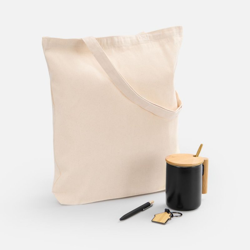 - Материал:кружка - керамика, крышка, ручка - бамбук; ложка - нержавеющая сталь; сумка - хлопок 100%, плотность 210 г/м²; саржа; брелок - бамбук, металл; ручка - металл, алюминий; кнопка - бамбук