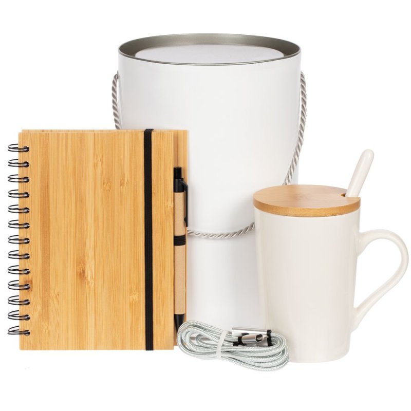 - Материал:кружка с ложкой - фарфор, нержавеющая сталь, бамбук; кабель - алюминий, нейлон, искусственная кожа; блокнот с ручкой - бамбук, картон, пластик; тубус - переплетный картон, жесть