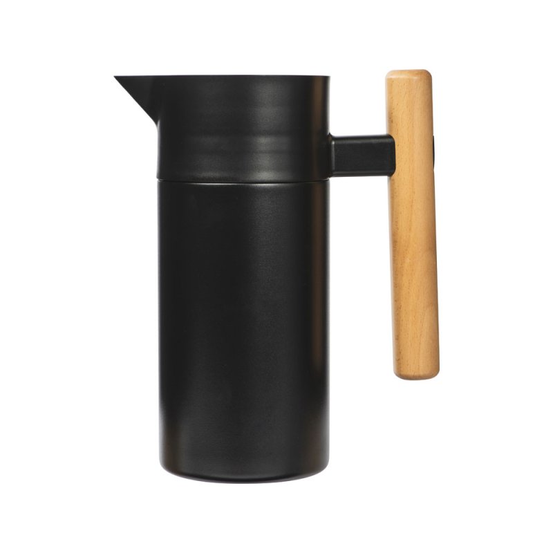Вакуумный термокувшин черного цвета, подходит для чая и кофе. Сохраняет температуру в течение 24 часов благодаря двойным стенкам с вакуумной изоляцией. Съемное ситечко из нержавеющей стали можно мыть в посудомоечной машине, а деревянная ручка термопота делает его использование особенно удобным и безопасным. Объем термочайника — 1200 мл, этого хватит на 4 обычных чашки чая.