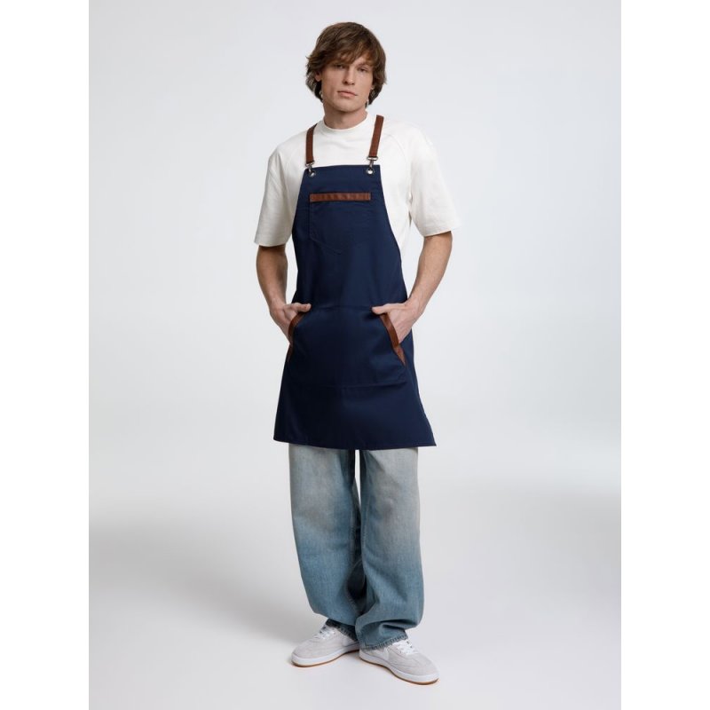 Функциональные карманы на груди и подоле эффектно украшают фартук, изготовленный из качественной дышащей плотной износостойкой ткани. Благодаря динамичным крестообразным лямкам он отлично сидит как на мужской, так и на женской фигуре. Кроме того, съемные лямки упрощают процесс стирки в стиральной машине.