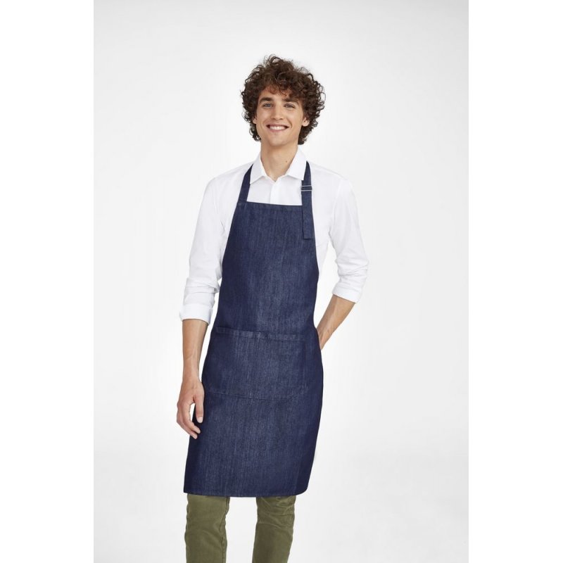 Стильный фартук из сырого денима с большими карманами спереди и регулируемой лямкой.
