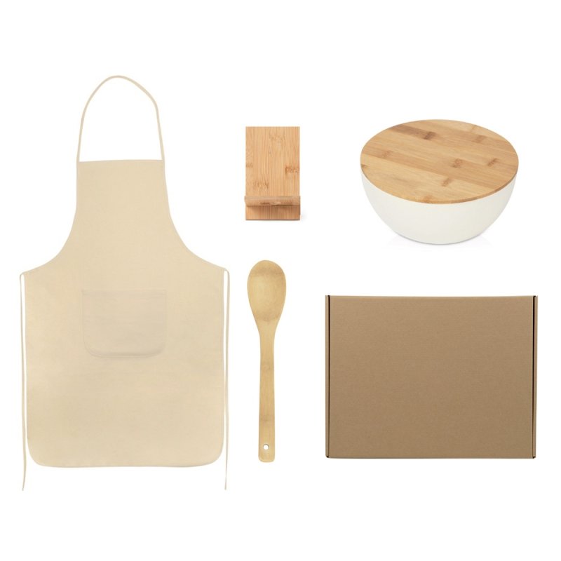 - Материал товара:салатник - 50% бамбуковое волокно, 30% кукурузный крахмал, 20% полимеры; крышка - натуральный бамбук, ложка, подставка - бамбук, фартук - хлопок, коробка - картон