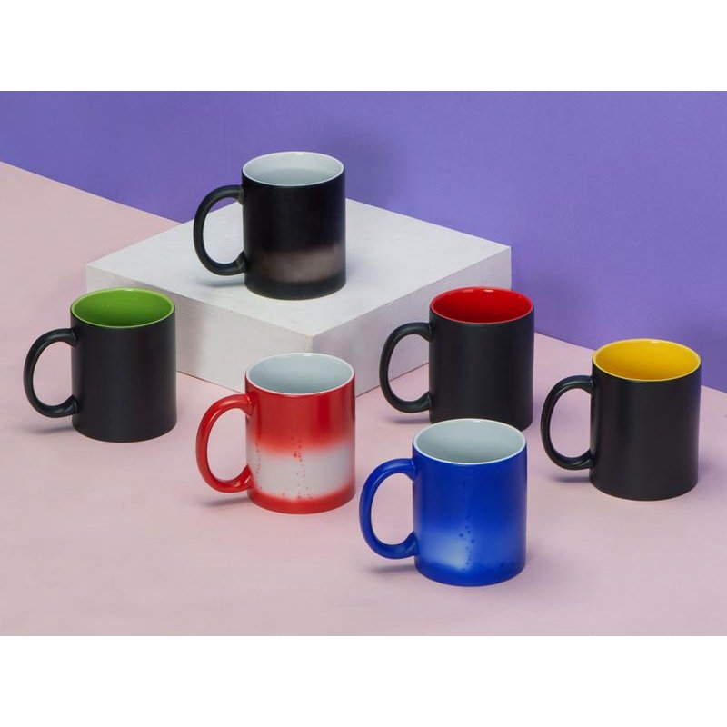 Кружка-хамелеон меняет свой облик, едва вы нальете в нее горячий напиток: черная поверхность постепенно изменяет свой цвет, становясь белой. Внутренняя часть кружки — яркая, цветная, что можно красиво обыграть, удачно сочетая ее с цветом вашего лого или гаммой изображения.