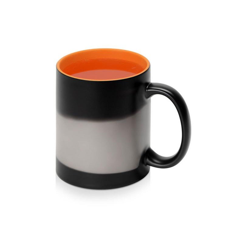 Кружка-хамелеон меняет свой облик, едва вы нальете в нее горячий напиток: черная поверхность постепенно изменяет свой цвет, становясь белой. Внутренняя часть кружки — яркая, цветная, что можно красиво обыграть, удачно сочетая ее с цветом вашего лого или гаммой изображения.