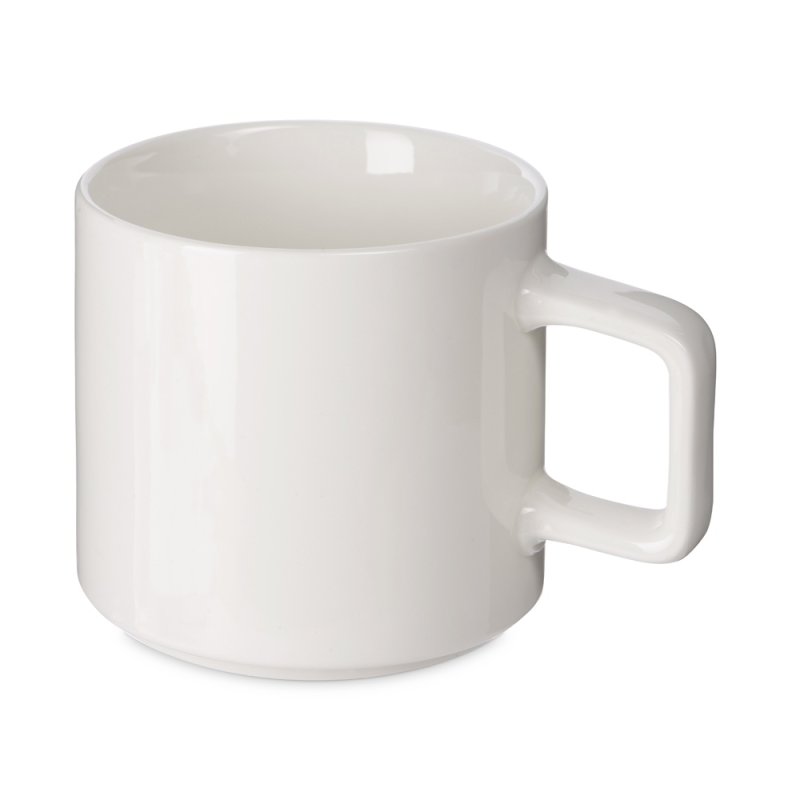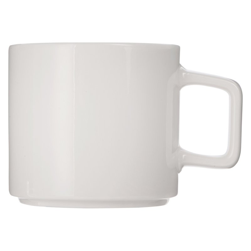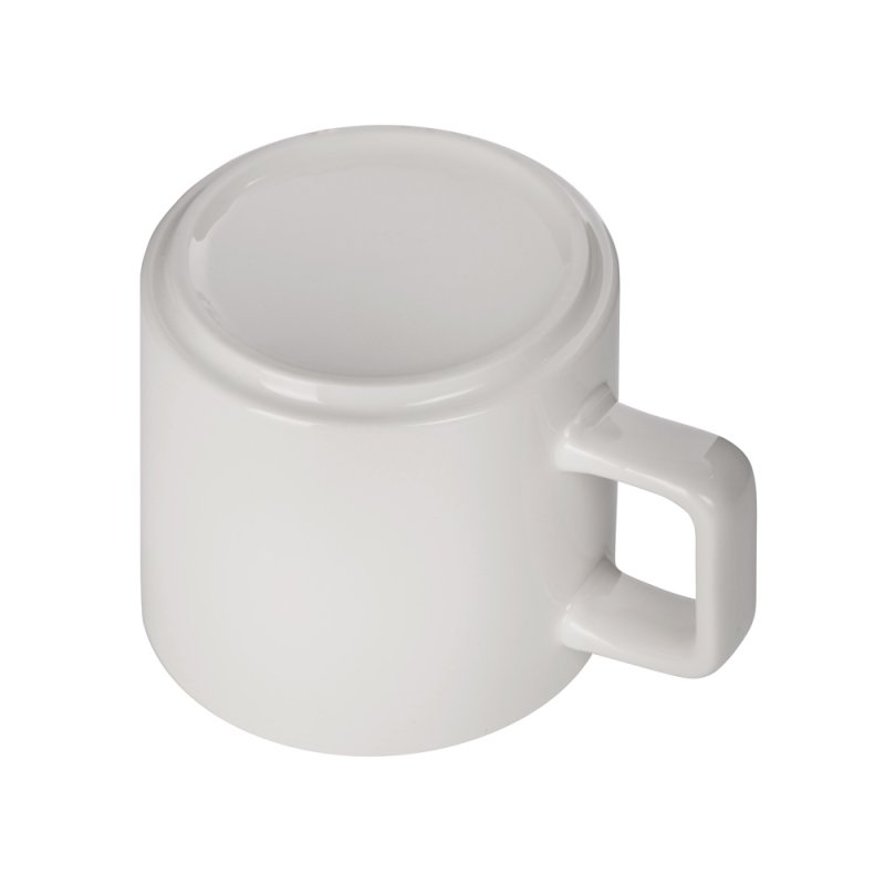 Белая кружка из костяного фарфора с удобной квадратной ручкой — широкой, комфортной для хвата и необычной формы. Форма дна позволяет ставить кружки друг на друга для экономии места: зацепленные друг за друга, выступом донышка, они не соскользнут друг с друга, выстроенные в ровную башню.