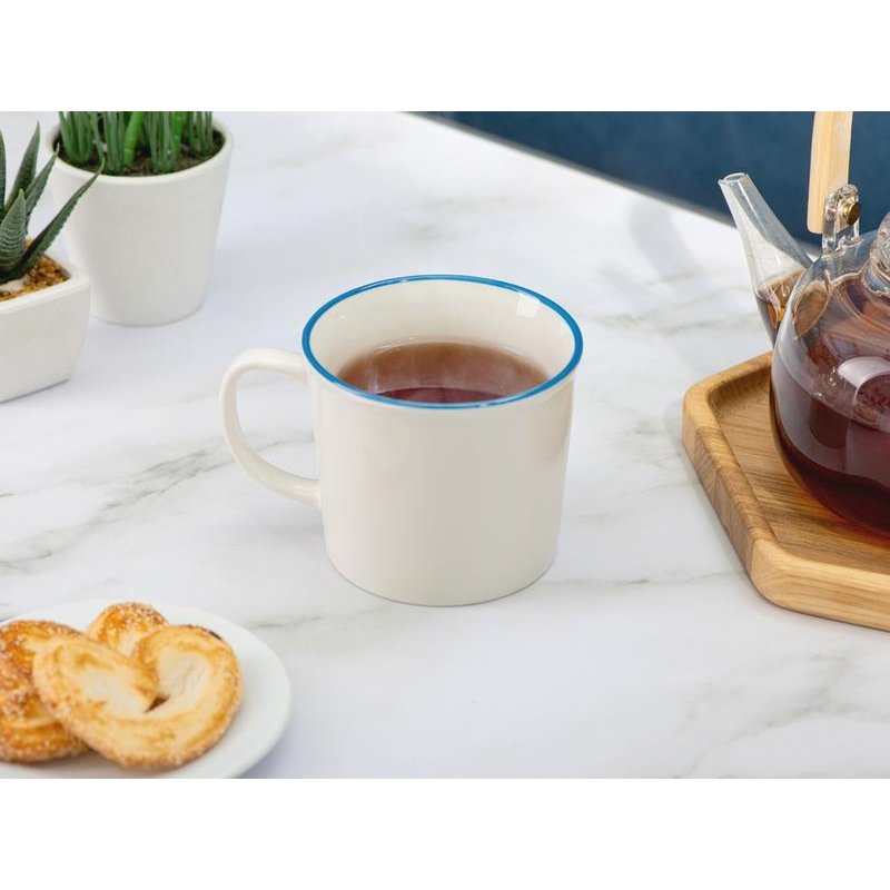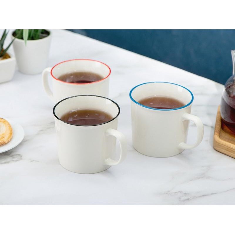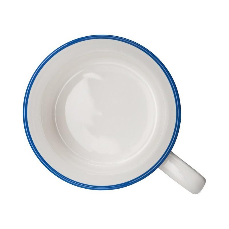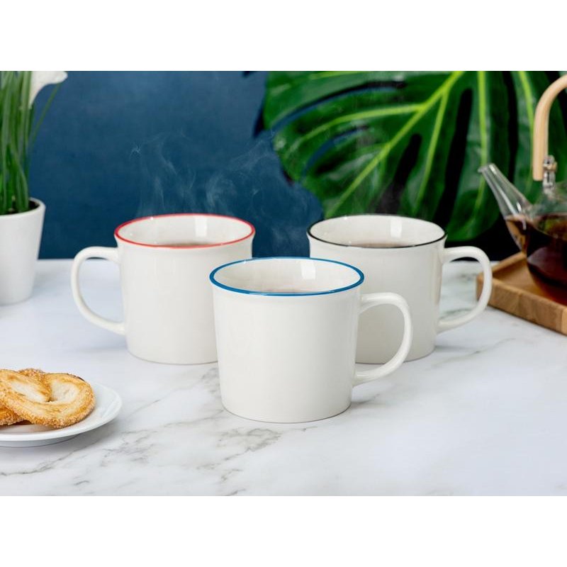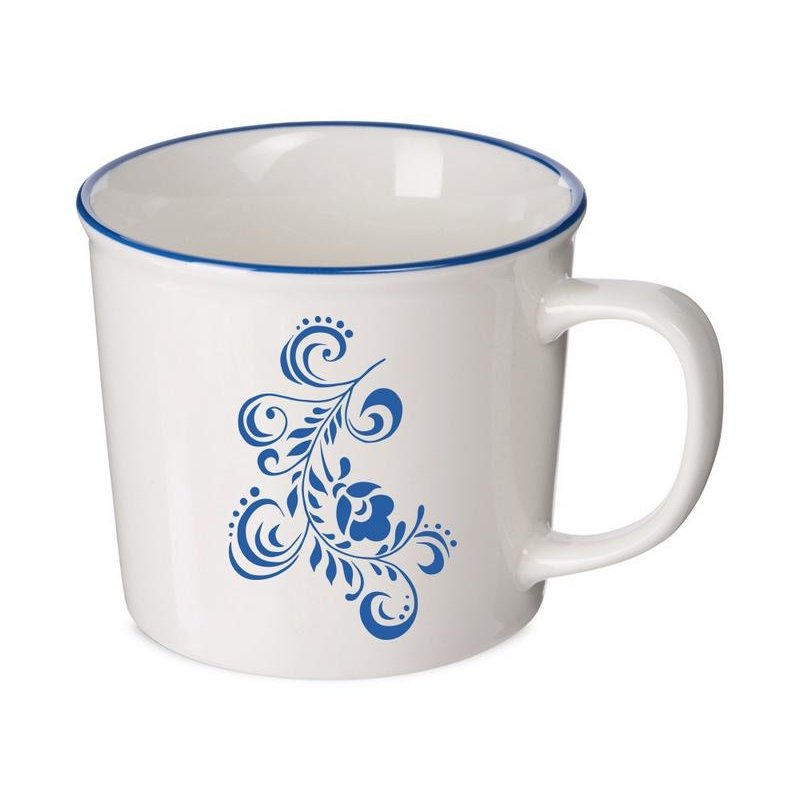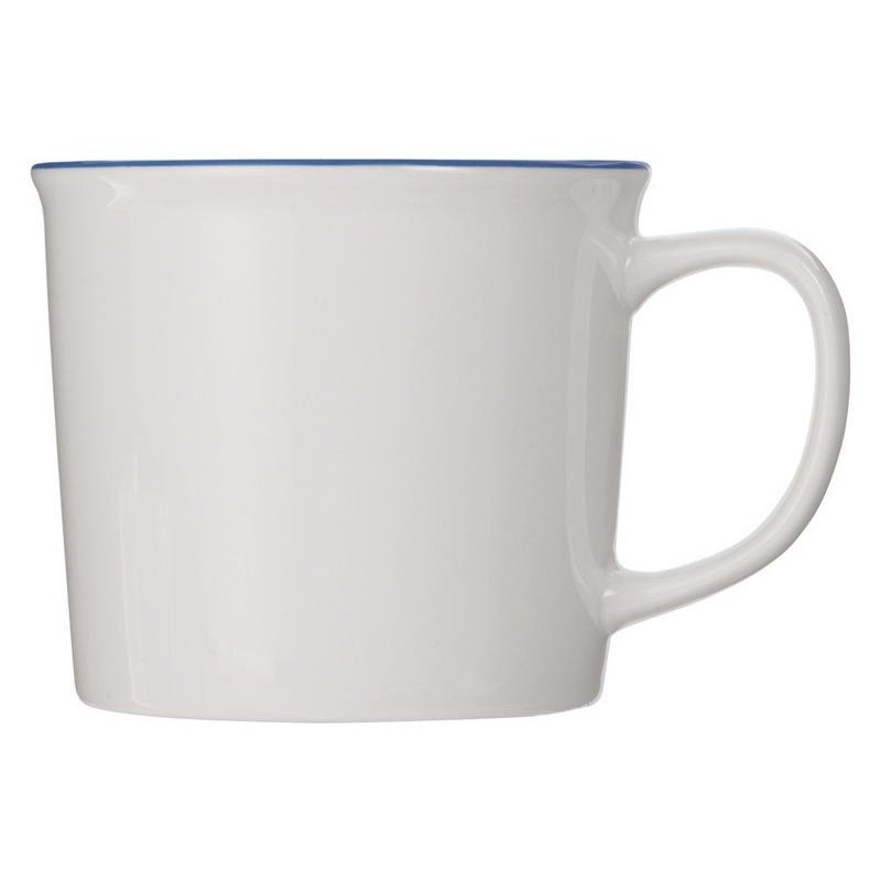 Кружка из костяного фарфора с выраженным рельефным ободком, окаймленным цветной контрастной полосой. Цвет полосы можно органично сочетать с цветом нанесенного логотипа, что придаст дизайну конечного продукта цельность облика.
