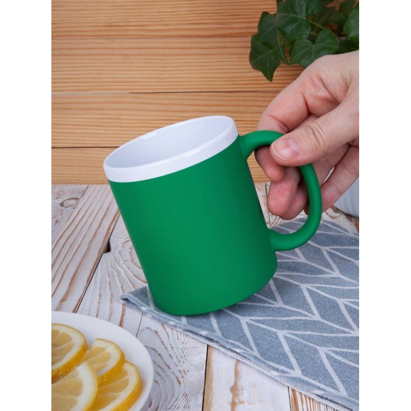 Кружка классической формы StopSpot привлекает внимание своим дизайном и покрытием. Яркая матовая поверхность выигрышно контрастирует с глянцевым белым ободком — так кружка выглядит необычно, а еще меньше пачкается во время эксплуатации.