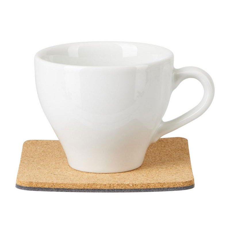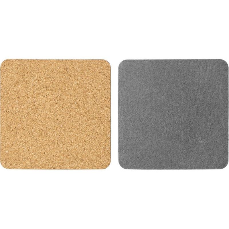 Четыре квадратных костера, выполненных из фетра и пробки. Благодаря выбору материалов посадка стаканов — мягкая и бесшумная: и пробка, и фетр заглушают звук, безопасны и для посуды, и для поверхности стола, защищая от механических повреждений и загрязнения.
